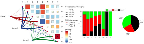 The PMF model was used to identify and distinguish the potential sources of toxic elements in the soil. Table 3 lists the optimal number of factors. In this study, the number of input factors was set to three, and the indicator judgments Q (Robust) and Q (True) were both 2.63102, with an error of less than 10%. This model was interpretable, and the BS inspection rate exceeded 80%; therefore, the results are usable. Factor contribution rate of PMF source resolution was shown in Figure 4.