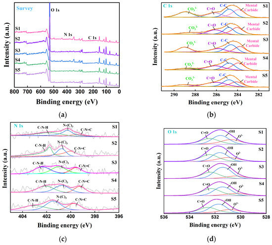 pXPS diagram of soil at five sample sites. (a) XPS full spectrum of five samples; (b) high-resolution spectrogram of C 1s; (c) high-resolution spectrogram of N 1s; (d) high-resolution spectrogram of O 1s.