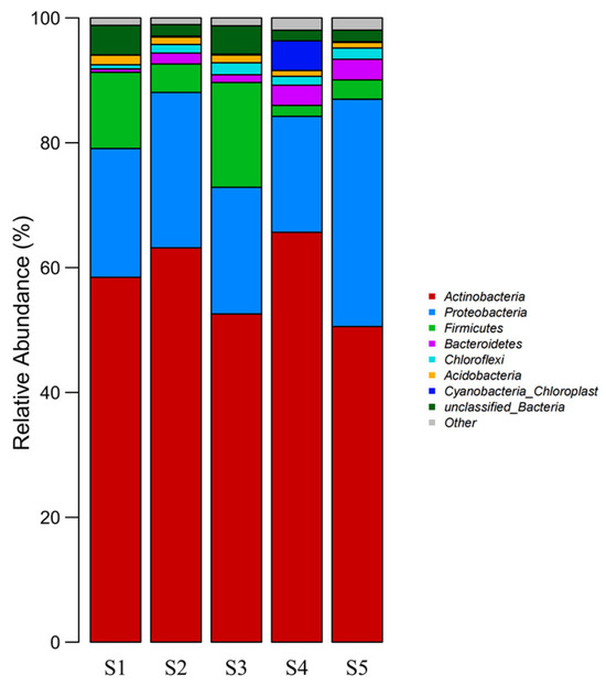 The sequencing results were annotated to obtain information on the different sequences at different classification levels (phylum, class, order, family, and genus). Based on the annotation results, the taxon results for phyla and genera were selected for statistical analysis. The relative abundances of the dominant bacterial phyla in the soil samples from each sampling point were analyzed. Actinobacteria and Proteobacteria had the highest bacterial content at the phylum level, followed by Firmicutes, Bacteroidetes, Chloroflexi, Acidobacteria, and Cyanobacteria_chloroplast (Figure 9). These seven phyla accounted for more than 80% of the average total bacterial count. Actinobacteria had the highest relative abundance, indicating its strong adaptability to PTE-contaminated soil environments (Figure 8). Proteobacteria also showed an abundance advantage in the five samples. In the S1–S5 samples, the S4 samples were significantly different from the other samples at the phylum level, and the microbial compositions of the other samples were slightly different from each other. Compared with the S1 sample without plant or leaching residue sites and with low pollution, the relative abundances of Actinobacteria and Proteobacteria in S2, with a high PTE content, increased by 4.72% and 4.25%, respectively. The relative abundance of Firmicutes decreased by 7.65% due to an increase in the concentration of PTEs. The results showed that Actinobacteria and Proteobacteria increased and Firmicutes decreased in PTE-contaminated soil.