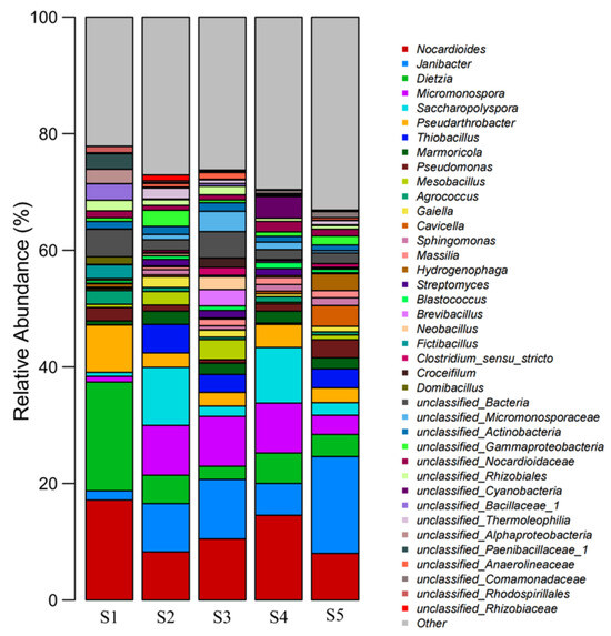 The relative abundances of the top 40 dominant bacterial species in the samples were analyzed. Nocardioides, Janibacter, Dietzia, Micromonospora, Saccharopolypora, and Pseudoarthrobacter were the dominant species (Figure 10). The abundances of these five groups of bacteria in the five samples (S1–S5) were 47.16%, 42.36%, 35.6%, 47.27%, and 36.37%, respectively. Pan et al. found that Nocardioides had a strong tolerance to one or more PTEs and could be used as a biological indicator of PTE pollution [31]. From S1 to S5, the proportions of Nocardioides were 17.15, 8.26, 10.49, 14.55, and 8.01%, respectively. The results showed that actinomycetes may be enriched in soils with a high PTE content. With an increase in metal content, the abundance of Janibacter groups also increased, similar to the results of the present study [32]. The content of Janibacter in the S1 sample without plant or leaching residue sites and with low pollution was 1.6%, and that in S2–S5 was 8.29%, 10.19%, 5.46%, and 16.60%, respectively. As the dominant species, Dietzia, Micromonospora, Saccharopolypora, and Pseudoarthrobacter all had the effect of removing high concentrations of PTEs [33,34,35].