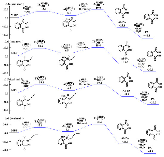 Considering the other -COO(R) functional groups, further OH−-mediated hydrolysis reactions of MMP, MEP, MPP, and MBP are investigated, and the PESs are presented in Figure 2. The OH−-mediated hydrolysis reaction pathways of each hydrolysate involve three elementary reactions: (i) OH−-addition to the target hydrolysates, (ii) intramolecular proton transfer reaction, and (iii) subsequent neutralization, resulting in the formation of phthalic acid (PA). The processes (i) and (ii) proceed via the corresponding TS, with ΔG‡ values ranging from 12.5 to 19.4 kcal mol−1, and the corresponding k values range from 60 to 8.0 × 105 M−1 s−1. Hence, phthalate monoesters (MMP, MEP, MPP, and MBP) and PA are the major hydrolysates of four PAEs.