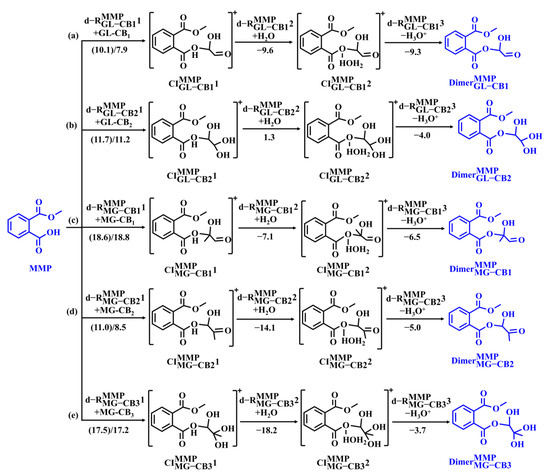 The natural population analysis (NPA) was conducted to evaluate the reactivity of the five hydrolysates (MMP, MEP, MPP, MBP, and PA) using the natural bond orbital (NBO) method. As depicted in Figure 3, O atoms of the hydroxyl groups in these hydrolysates exhibit negative charge characteristics with the NPA charge values of −0.71 e, implying that these hydrolysates are likely to nucleophilic attack electrophilic species. For the aqueous solution containing glyoxal (GL) and methylglyoxal (MG), carbenium ions are broadly and rapidly formed [43,55], representing a class of electrophilic species. Herein, first-generation carbenium ions (CBs) are selected for the nucleophilic reactions with hydrolysates mentioned above to engage in GL/MG oligomerization. The PESs for the possible nucleophilic pathways of five hydrolysates with GL/MG-CBs are shown in Figure 4 and Figures S9–S13. The optimized geometries of all SPs in the dimerization pathways are shown in Figures S14 and S15.