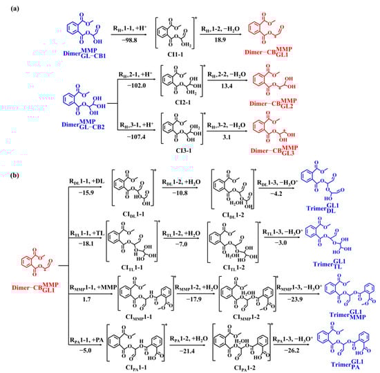 As discussed above, there is the formation of twenty-five ester-like dimers in the PAE-mediated dimerization of GL/MG, which have the potential to undergo further oligomerization due to the presence of hydroxyl groups (Figures S14 and S15). Herein, we take and as the representatives of ester-like dimers to investigate the subsequent trimerization because the hydrolysis reaction of DMP yields MMP with the highest k value and the k values for MMP-mediated dimerization in the GL reaction system are higher than those of the MG system. The PESs for the subsequent pathways of and are presented in Figure 5a. For , the protonation occurs at the -OH group (RH+1-1) to form CI1-1, which subsequently undergoes dehydration (RH+1-2), with the total ΔGr value of −79.9 kcal mol−1, to yield . Similarly, proceeds via protonation (RH+2-1 and RH+3-1), and dehydration (RH+2-2 and RH+3-2), to yield and , with the total ΔGr values of −88.6 and −104.3 kcal mol−1, respectively. In conclusion, three Dimer-CBs are generated via sequential protonation and dehydration of and .