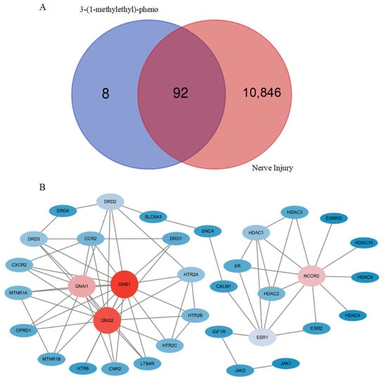 Prediction of the toxicity of 3-isopropylphenol based on network toxicology. (A) Venn diagram of the toxicity targets of 3-isopropylphenol and the targets related to nerve injury. (B) The PPI network of the potential targets, the darker the color of a node, the higher its degree centrality.