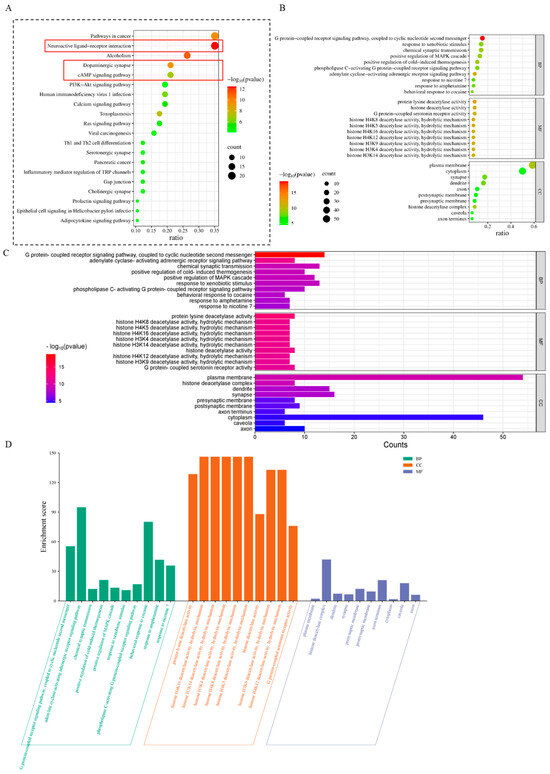 In the enrichment of KEGG signaling pathways, various signal-related pathways emerged significantly, including the neuroactive ligand–receptor interaction, dopaminergic synapse, and cyclic adenosine monophosphate (cAMP) signaling pathway. Moreover, in the GO terms, the G protein-coupled receptor signaling pathway coupled to cyclic nucleotide second messengers also emerged significantly. These findings are consistent with the types of neurodevelopmental damage.
