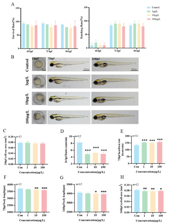 Wild-type AB strain zebrafish and transgenic strains Tg (huc:eGFP) and Tg (hb9:eGFP) were obtained from the Institute of Hydrobiology, Chinese Academy of Sciences (IHB, Wuhan, China). The wild-type AB strain was used to study some basic indicators, such as fetal movement, body length, heart rate, and other indicators; Tg (huc:eGFP) zebrafish was used to study the influence of central nervous system neuron development; and Tg (hb9:eGFP) was used to study the influence of motor neuron axon growth. Adult zebrafish were kept in a recirculating water system with a water temperature of 28 ± 0.5 °C and a photoperiod of 14 h light/10 h dark and were fed twice daily with live Artemia. To obtain fertilized eggs, male and female zebrafish were placed in a breeding tank at a ratio of 1:2 the day before spawning. Early the next morning, the partition boards were removed to allow the zebrafish to spawn naturally under light conditions. Then, healthy embryos were selected under a microscope for the subsequent exposure experiment. All animal experiments were conducted in accordance with the guidelines for the care and use of laboratory animals of the Nanjing Institute of Environmental Sciences (IACUC—20240912).