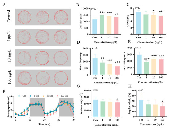 Effects of exposure to 3-isopropylphenol on the locomotor behavior of zebrafish larvae. (A) Trajectories of locomotor behavior, (B) immobility time, (C) activity level, (D) frequency of manic behavior, (E) frequency of active behavior, (F) average locomotion speed, (G) acceleration, and (H) angular velocity of zebrafish larvae after exposure until 144 hpf. The data are presented as the mean ± standard deviation of three independent experiments (n = 12). p values: p < 0.001 (***), p < 0.01 (**), and p < 0.05 (*).