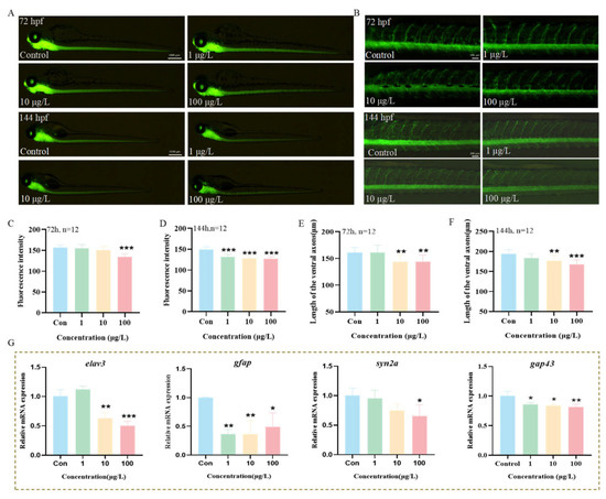Zebrafish, widely used in environmental pollutant studies [11], has neurological development remarkably similar to mammals [12]. Due to their small size, low cost, and rapid development [13,14], they are extensively used in toxicity evaluations. Moreover, the optical transparency of zebrafish embryos enables researchers to observe individual cells during development, facilitating in vivo imaging and dynamic tracking within the whole organism. With a relatively short generation cycle of 3–4 months, zebrafish are also suitable for genetic research. Based on these characteristics, zebrafish are highly suitable for transgenic technology to express green fluorescent protein (GFP) or other fluorescent proteins [15,16]. Transgenic lines like Tg (huc:eGFP) and Tg (hb9:eGFP), which allow direct observation of neuron development and motor neuron axon growth [17], have been widely applied in toxicological research [18].