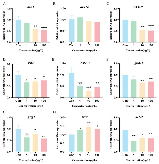 To further explore how 3-isopropylphenol affects zebrafish larval neural development, we exposed zebrafish embryos to 3-isopropylphenol until 144 hpf. Then, we extracted RNA and conducted a quantitative analysis of gene expression levels in the cAMP/PKA signaling pathway. The results showed that when the exposure concentration was 10 μg/L, the expression of the dopamine receptor drd1 gene was significantly inhibited (Figure 7A, p < 0.01), while there was no significant difference in the expression of drd2a (Figure 7B). At the same time, compared with the control group, the expression levels of cAMP, PKA, and CREB genes decreased significantly (Figure 7C–E). Among them, the expression levels of the core target genes gnb1b and gng2 also decreased accordingly (Figure 7F,G). These results indicate that 3-isopropylphenol inhibits the transduction of the cAMP/PKA signal in zebrafish larvae. There were significant differences in the expression of the bad and bcl-2 starting from an exposure concentration of 1 μg/L (Figure 7H,I), suggesting that 3-isopropylphenol induces apoptosis of neural cells in zebrafish larvae.