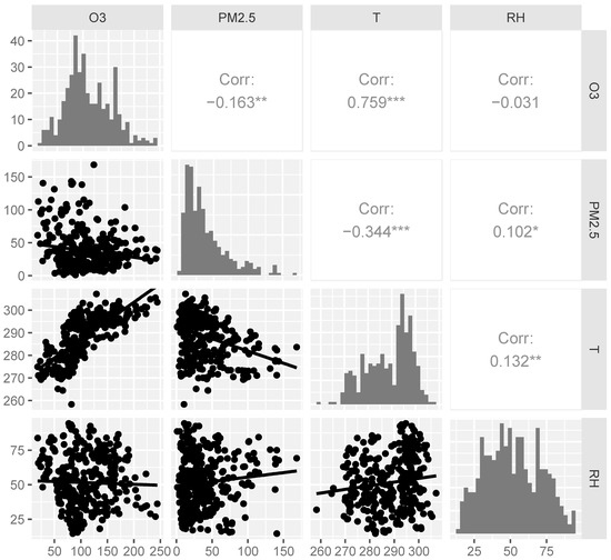 This panel study included 312 asthma patients with a total of 399 lung function records. Table 1 presents the baseline demographic and small airway function information of the cohort. A total of 55.1% of the cohort were female, and 91.0% reported never smoking. The mean age was 40.87 years, with an average BMI of 24.26 kg/m2. Prebronchodilator (pre-BD) measurements for FEF50%pred, FEF75%pred, and FEF25–75%pred averaged 71.74%, 61.96% and 70.71%, respectively. The postbronchodilator (post-BD) values were slightly higher: 79.57%, 70.93%, and 78.86%, respectively. The ambient environmental variable information of the day the lung function tests were conducted is summarized in Table 2. The average concentrations of O3 and PM2.5 were 111.01 μg/m3 and 37.49 μg/m3, respectively. There are 272 instances in the warm season where the average O3 concentration reached 129.72 μg/m3, significantly higher than in the cold season (p < 0.001). Additionally, the PM2.5 concentration in the cold season was significantly higher than in the warm season (p < 0.001). The average temperature was 288.71 K, with an RH of 51.54%. We analyzed the correlations among the ambient environmental variables via Spearman correlation analyses. Notably, O3 showed a strong positive correlation with temperature (r = 0.759, p < 0.001) and a weak negative correlation with PM2.5 (r = −0.163, p < 0.01), as illustrated in Figure 1.
