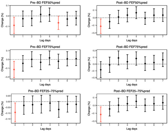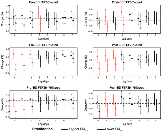 Effects of ambient O3 at lag0–lag7 on small airway function parameters across different PM2.5 levels. The red lines indicate significant differences in the associations between O3 and small airway function parameters at higher and lower PM2.5 levels (p < 0.05).