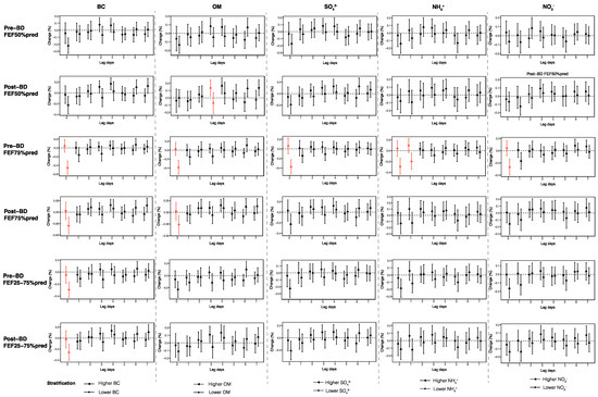 Effects of ambient O3 at lag0–lag7 on small airway function parameters across different levels of PM2.5 constituents. The red lines indicate significant differences in the associations between O3 and small airway function parameters at higher and lower levels of PM2.5 constituents (p < 0.05).