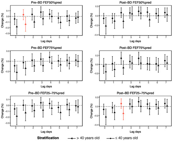 Stratified analyses of the associations between ambient O3 at lag0–lag7 and small airway function parameters on the basis of age. The red lines indicate significant differences in the associations between O3 and small airway function parameters in individuals over and under 40 years of age (p < 0.05).