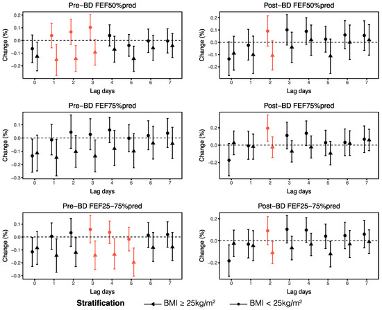 Stratified analyses of the associations between ambient O3 at lag0–lag7 and small airway function parameters on the basis of BMI. The red lines indicate significant differences in the associations between O3 and small airway function parameters in individuals with BMI greater than 25 kg/m2 and less than 25 kg/m2 (p < 0.05).