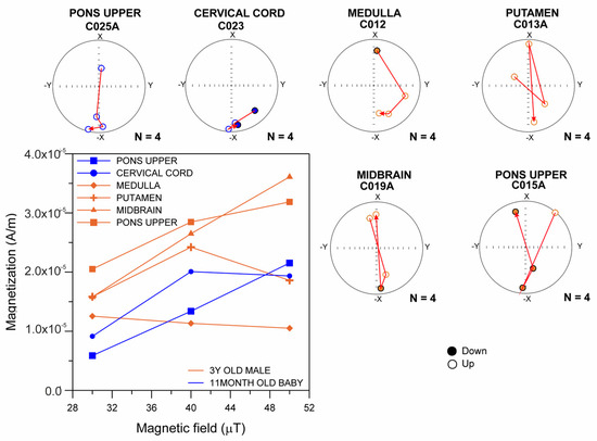 Figure 1 shows the ARM magnetization curves obtained between 30 and 50 µT, indicating the presence of ferrimagnetic minerals with single-domain grain size (0.03–0.1 μm) in an 11-month-old infant and a 3-year-old child. Almost all their samples showed ARM variations at 40 and 50 µT, indicating magnetic NP changes in orientation during the acquisition. Displacements of magnetic particles responding to the combined fields of 100 mT AC and 40 to 50 µT DC are documented in young children.