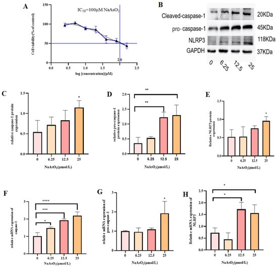 (A) MIHA cell viability following treatment with varying NaAsO2 concentrations (n = 12). (B) Representative immunoblots showing NLRP3, pro-caspase-1, and caspase-1 protein bands. (C–E) Protein-expression levels of NLRP3, pro-caspase-1, and caspase-1 in MIHA cells under different NaAsO2 concentrations. (F–H) mRNA-expression levels of NLRP3, pro-caspase-1, and caspase-1 in MIHA cells treated with NaAsO2. (* p < 0.05, ** p < 0.01, *** p < 0.001, **** p < 0.0001, indicating statistically significant differences).