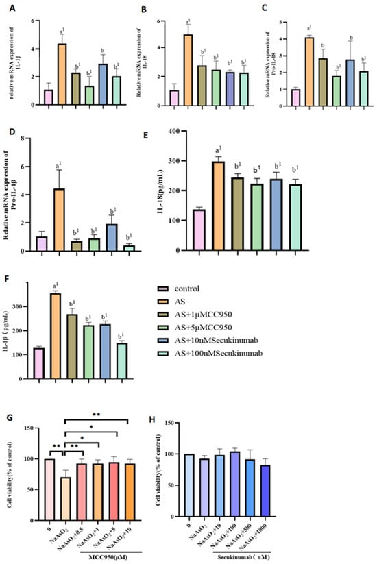 (A–D) PCR was used to detect the mRNA-expression levels of pro-IL-18, pro-IL-1β, IL-18, and IL-1β in MIHA cells treated with different concentrations of the inhibitors MCC950 and secukinumab. (E,F) ELISA was used to detect the expression of IL-18 and IL-1β proteins in MIHA cell-culture supernatant treated with the inhibitors MCC950 and secukinumab. (G,H) The effects of MCC950 (NLRP3 inhibitor) and secukinumab (IL-17 inhibitor) on the viability of MIHA cells; a: the NaAsO2-exposed group was compared with the control group; b: inhibitor group compared with NaAsO2 group. With p < 0.05; the difference was statistically significant. (* p < 0.05, ** p < 0.01, b p < 0.05; a1,b1 p < 0.01).