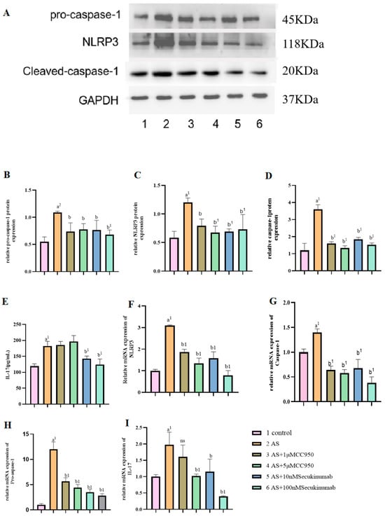(A) Bands visualized for pro-caspase-1, caspase-1, and NLRP3 proteins. (B–D) Effect of pretreatment with MCC950 and secukinumab on the expression of proteins associated with inflammation and pyroptosis in MIHA cells stained with NaAsO2. (E) ELISA assay of expression levels of the inflammatory factor IL-17 in MIHA cell-culture supernatant. (F–I) PCR for pro-caspase-1, caspase-1, NLRP3, and IL-17 mRNA expression in MIHA cells. a: NaAsO2 group vs. control group (a1 p < 0.01), b: NaAsO2 group vs. inhibitor group (b p < 0.05, b1 p < 0.01). ns: Compared with the NaAsO2 group, p > 0.05, the difference was not statistically significant. At p < 0.05, differences were statistically significant.