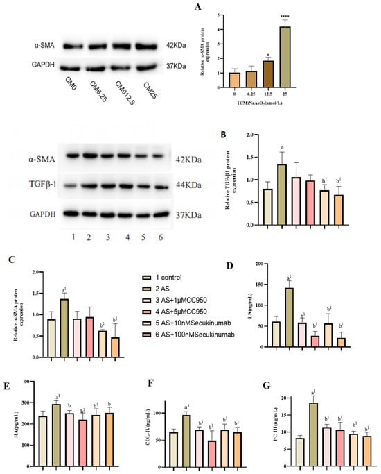 Compared with the control group, the expression of α-SMA in LX-2 cells was gradually increased in a dose-dependent manner after treatment with MIHA cell supernatant after NaAsO2 treatment (p < 0.05). These results indicated that the conditioned medium could successfully activate LX-2 cells and induce the activation of hepatic stellate cells (e.g., Figure 4A). As shown in (e.g., Figure 4B,C) reatment of LX-2 cells with MIHA cell-culture supernatants resulted in increased expression of α-SMA and TGF-β1 in the NaAsO2-exposed group. However, following treatment with MCC950 and secukinumab at varying concentrations, the expression of α-SMA and TGF-β1 in hepatic stellate cells was significantly reduced, with a more pronounced decrease observed after IL-17 inhibition. Furthermore, ECM expression was detected in the culture medium of LX-2 cells, revealing that the levels of ECM components, including HA, LN, PC-III, and COL-IV, were elevated in the treated group. However, these levels were found to decrease following various inhibitory treatments, suggesting that treatment of the conditioned medium induced the activation of LX-2 cells, leading to an increase in collagen formation, α-smooth muscle actin expression, and ECM deposition (e.g., Figure 4D–G).