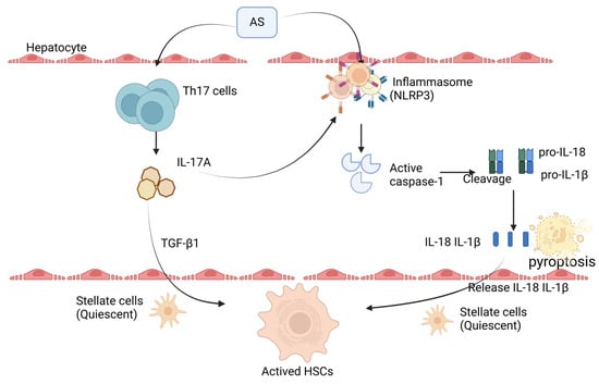 Arsenic exposure triggers hepatic inflammation, activating the NLRP3 inflammasome. This activation drives the conversion of pro-caspase-1 into active caspase-1, which processes pro-IL-18 and pro-IL-1β into their mature forms, IL-18 and IL-1β, enabling their secretion. These cytokines induce hepatocyte pyroptosis and activate HSCs, leading to excessive extracellular matrix (ECM) deposition. Furthermore, arsenic exposure stimulates hepatocytes to release IL-17, a pro-inflammatory cytokine that can either indirectly activate HSCs by regulating inflammatory mediators or directly promote HSC activation. These findings underscore the complex interplay between IL-17, inflammasome activation, pyroptosis, and HSC activation.