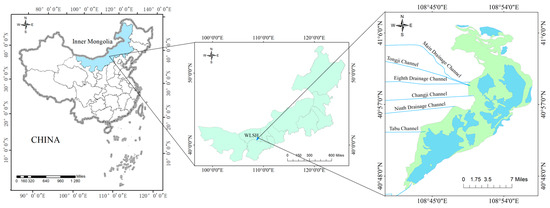 Geographical location of Wuliangsuhai. The green color in the right image represents the reed area, and the blue color represents the clear water area.