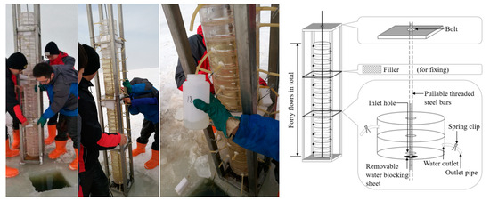 According to the measurement results of ice and water samples from 21 monitoring points in the entire lake in previous years, the average ice thickness of the lake is 0.64 m, the average water depth is 1.62 m, and the content of metallic Hg in the ice water below point L15 is 1.2025 μg/L [9], exceeding the Class V standard for surface water (1.0 μg/L) and the national fishery water standard (0.5 μg/L). Based on the analysis of data from previous years, the triangle in Figure 2 was selected as the sampling point. At this point, water environmental parameters such as water depth, mud thickness, and ice thickness have reached the average level, and heavy metal pollution is relatively severe. In order to balance the safety of the experimental environment and the integrity of the samples, the sampling time is set from the end of December to mid-January each year. At this time, the Wuliangsuhai enters a completely frozen stage, and winter sample collection and on-site monitoring work continue until the lake begins to melt and the lake ice cannot support on-site sampling work. The first sampling time in the winter of 2018 was on January 4, and the subsequent sampling times were on average every 10 days, including January 17, January 31, February 5, February 15, February 22, March 4, and March 11 as the last sampling, covering 67 days in 2018. The samples were collected every 5 cm up to a depth of 150 cm for a total of 30 layers. Using a GPS column sampler for positioning, a 50 cm × 50 cm square border was drawn at the sampling point. Before sampling, the ice body was cut off along the edges of the square using an electric saw and then removed. After taking the ice body, wait for the water body to stabilize, slowly place the homemade layered water collector into the water (Figure 3) so that the lake water gradually fills each layer of water intake device from the bottom inlet of the layered water collector, with a height of 5 cm for each layer of water intake device, until the bottom layer of the water collector is the mud–water interface. Lift the pull-out threaded steel bar up and tighten the bolts on the top plate of the water collector with a wrench. Therefore, the movable water-blocking plate at the bottom of each layer of water intake container closes the inlet of each layer. Finally, take out the entire water sample and the water collector together, open the spring clamp on the side of each layer, and put each layer of water sample into a polyethylene plastic bottle according to the layer number. Finally, collect 30 layers of water samples. Seal the water sample and bring it back to the laboratory.