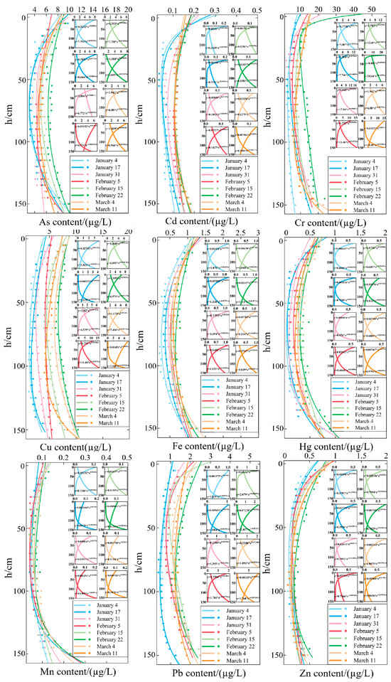 In terms of the vertical spatial distribution, the contents of heavy metals in Wuliangsuhai under the ice cover at different times revealed a C-shaped distribution characterized by an initial decrease, followed by an increase with increasing depth. The vertical distribution profile of heavy metals under the ice cover at different times can be expressed by a C-shaped function that depends on the depth of the water body. Therefore, a C-type distribution model (binomial index model) that depends on the depth of the water body is selected to describe the spatiotemporal distribution of heavy metals under the ice cover: