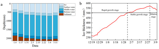Ice growth in Wuliangsuhai. (a) represents that the depth of the upper, middle, and lower water samples obtained each time varies with the thickness of the ice layer; (b) represents the three stages of ice thickness changes monitored since December 19.
