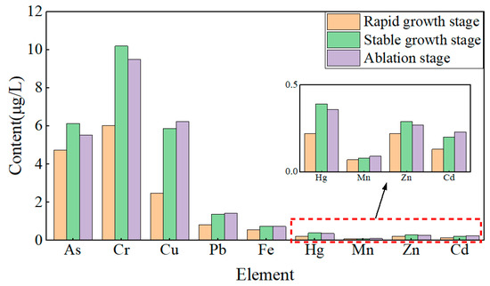 During the rapid growth stage of lake ice, the contents of As, Cd, Cr, Cu, Fe, Hg, Mn, Pb, and Zn in the water below the ice were 4.73 μg/L, 0.13 μg/L, 6.01 μg/L, 2.48 μg/L, 0.56 μg/L, 0.22 μg/L, 0.07 μg/L, 0.82 μg/L, and 0.22 μg/L (Figure 6), respectively. During the stable growth stage of lake ice, the growth rate of heavy metal content ranges from 14.29% to 136.69%. During the melting stage of lake ice, the reduction rates of As, Cr, Fe, Hg, and Zn were 10.11%, 6.87%, 1.35%, 7.69%, and 6.90%, respectively. The growth rates of Cd, Cu, Mn, and Pb are 15%, 6.13%, 12.5%, and 4.38%, respectively. Analysis shows that the content of heavy metals As, Cr, Fe, Hg, and Zn increases significantly with increasing ice thickness and slightly decreases with decreasing ice thickness. The content of heavy metals Cd, Cu, Mn, and Pb increases significantly with increasing ice thickness and slightly increases with decreasing ice thickness. In addition, during the three stages of lake ice change, the heavy metal content in the upper and lower layers of water is higher than that in the middle layer, showing a stable C-shaped distribution.
