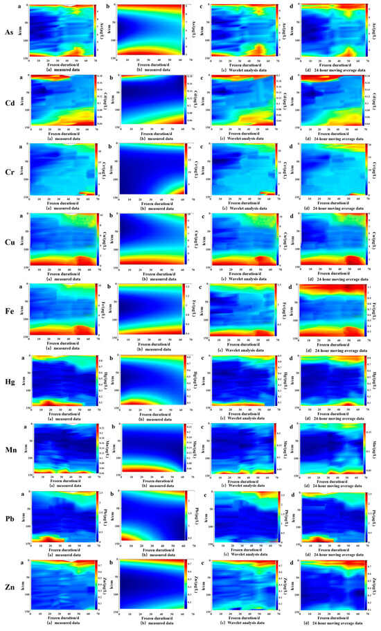 Verifying the model with measured values is a crucial step in scientific research aimed at evaluating the degree of fit between the established theoretical model and actual data. When the predicted results of the model match the measured values well, it not only verifies the accuracy of the model but also enhances its credibility in explaining phenomena and predicting future trends. This study plotted contour lines of measured values of various heavy metals with water depth and ice cover duration, as shown in Figure 9a. The contour lines of the model and feature parameter equation simulation calculation are shown in Figure 9b; the contour lines of heavy metal content using the wavelet analysis method are shown in Figure 9c; the contour lines of heavy metal content using the moving average method are shown in Figure 9d. It can be observed that there are many jumping points in the heavy metal content in the wavelet analysis method [30] and the moving average method [31], resulting in uneven contour lines and large errors (4.61~21.98%). This is because the shape and scale of the wavelet function are fixed and cannot adapt to sensitive data changes. In this study, the Cd, Hg, Mn, and Zn contents were small, the amplitude of change was small, and the wavelet analysis method could not make accurate predictions for them; the 24 h sliding average method weights the average of the data and moves it period by period at a certain interval length, which can only predict short-term trends and is not suitable for the 67-day long-term prediction in this study. The model presented in this article has different reference coefficients for different heavy metals, allowing each heavy metal to have its own prediction path and refining the prediction method. At the same time, the modeling process can adjust the smoothness of the graph, which is smoother than the graphs obtained directly from wavelet analysis and the 24 h slip mean method. Comparing the simulated values of the model with the measured values, the data error is between 0.96% and 4.92% (Table 2), indicating that the estimation model for the spatiotemporal distribution of heavy metal content in the water body during the freezing period is more accurate. This means that the model can capture the overall trend of the data, reflecting the continuity and consistency of the model in describing phenomena, ensuring that the model can be effective and reliable in practical applications and can be further analyzed and predicted more reliably based on the model.