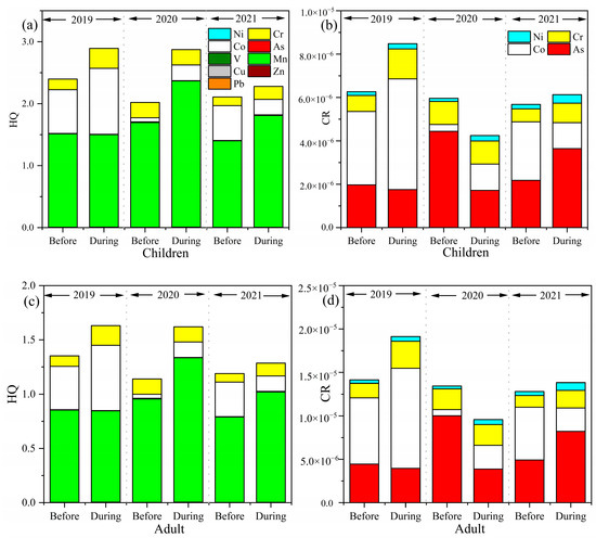 For children, the mean HQ values of the nine trace elements in 2019 were 2.40 (before the heating period) and 2.89 (during the heating period), respectively (Figure 2). The change rates of average HQ values before and during the heating period for children were similar to adults in 2020 and 2021, and the HQ exceeded the acceptability limit (1.00 × 10−6). The HQ values of Mn (1.49, 2.33 and 1.81) in the heating period over three years were greater than other trace elements, followed by Pb (6.75 × 10−3, 6.20 × 10−3 and 4.87 × 10−3) and As (4.50 × 10−3, 4.35 × 10−3 and 9.35 × 10−3). The CR values of the nine trace elements over three years in the heating period were 8.48 × 10−6, 4.25 × 10−6 and 6.13 × 10−6, respectively, which were exceeded the acceptable limit (1 × 10−6), showing a carcinogenic risk. The CR values of As (1.75 × 10−6, 1.69 × 10−6 and 3.64 × 10−6) in the heating period were the highest, followed by that of Co (5.11 × 10−6, 1.21 × 10−6 and 1.20 × 10−6) and Cr (1.38 × 10−6, 1.06 × 10−6 and 8.99 × 10−7), while that of Ni was the lowest (2.41 × 10−7, 2.49 × 10−7 and 3.94 × 10−7). As was a crucial element driving carcinogenic risk and should be given more attention in Shijiazhuang. This is consistent with the research by Diao [42]. High concentrations of As mainly originated from coal combustion [43,44,45]. Wang et al. [28] found that As was the key element contributing to the cancer risk in Linfen, while Cd and Ni were carcinogenic to humans in Changzhi [46], and As, Cr, Ni and Co in Huangshi [47].