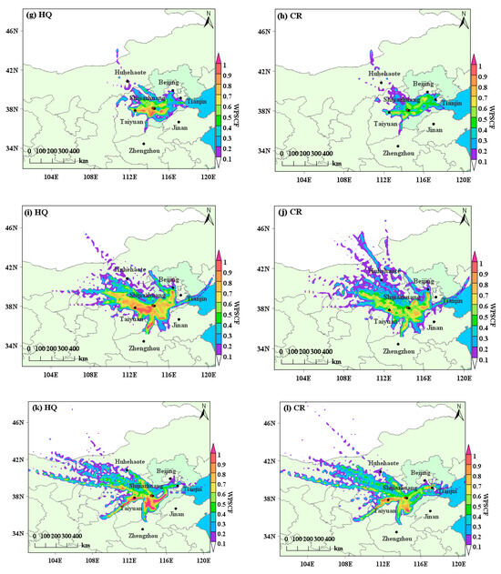 The WPSCF for health risks of selected trace elements before and during the heating period over three years, (a–d) were in 2019, (e–h) in 2020, and (i–l) in 2021. WPSCF for HQ (a,e,i) and CR (b,f,j) before the heating period, and HQ (c,g,k) and CR (d,h,l) in the heating period for three years, respectively.