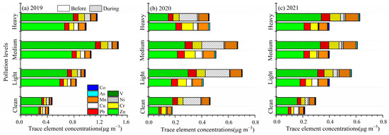 Before the heating period in 2020, the total concentrations of nine trace elements were 2.20 (light), 2.77 (medium) and 2.63 (heavy) times greater than at the clean level. For example, the concentrations of Cu, Zn and Mn increased by 6.03, 2.20 and 2.18 (light), 8.09, 2.77 and 2.60 (medium), and 4.80, 2.63 and 2.38 (heavy) times, respectively. The concentrations of Pb, Cr and As increased by 2.37~2.88, 1.87~2.48 and 1.41~1.64 times, respectively. Additionally, the concentration of Co at medium pollution was 11.07 times greater than at the clean level. During the heating period in 2020, the total concentration of nine selected elements in light and medium pollution were 1.51 and 1.64 times greater than at the clean level, while the heavy pollution level concentration was similar to the clean level. The concentrations of Cr, Mn and Cu increased by 11~72% in light pollution, 27~59% in medium pollution and 3~37% in heavy pollution compared to the clean level, respectively.