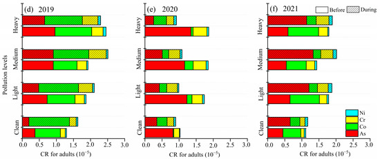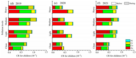 Before the heating period in 2020, the HQ values of Mn and Co were 2.18 and 6.55 (light), 2.60 and 11.07 (medium) and 2.38 and 2.76 (heavy) times higher than at the clean level, respectively (Figure 5 and Figure 6). The HQ value of Cr increased by 1.87~2.48 times compared to the clean level. In addition, the HQ of Cu at the clean level for adults and children reached 4.45 × 10−5 and 7.89 × 10−5, respectively, which was 6.03 (light), 8.09 (medium) and 4.80 (heavy) times higher. During the heating period in 2020, the total HQ values showed an obvious increasing trend at the light and medium pollution levels, which were 1.94 and 2.05 for adults and 3.45 and 3.63 for children, respectively. Before the heating period in 2020, As was the most carcinogenic metal, and the average proportions of As were 79.82% (clean), 70.69% (light), 62.73% (medium) and 72.19% (heavy). During the heating period in 2020, the CR of As (3.48 × 10−6 for adults and 1.54 × 10−6 for children) was 1.21 (light) and 1.46 (medium) times higher than at the clean level. The CR value of Cr and Ni increased by 1.11~1.72 times and 1.04~1.38 times compared to the clean level.