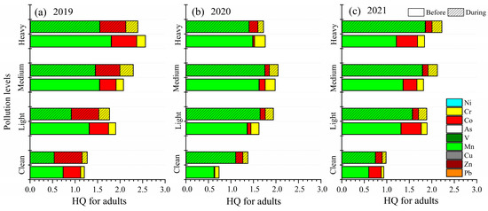 Before the heating period in 2021, the HQ value of the selected trace elements represented a clear increasing trend with pollution levels increasing (Tables S7–S12). The HQ values of Mn and Cr were 2.19 and 2.26 (light), 2.27 and 2.56 (medium) and 2.02 and 2.75 (heavy) times higher than at the clean level. During the heating period in 2021, the average proportions of Mn were 75.43% (clean), 82.69% (light), 84.08% (medium) and 83.25% (heavy) at different pollution levels. The HQ value of Cr was 2.12 (light), 2.41 (medium) and 2.52 (heavy) times higher than at the clean level. Before the heating period in 2021, the CR value of the selected trace elements represented a clear increasing trend. The CR values of Co and Ni increased by 1.11~1.70 times and 1.05~1.22 times compared to the clean level. During the heating period in 2021, the CR of As (1.97 × 10−6 for adults and 2.92 × 10−6 for children) increased by 1.84 (light), 2.02 (medium) and 1.73 (heavy) times higher than the clean level.