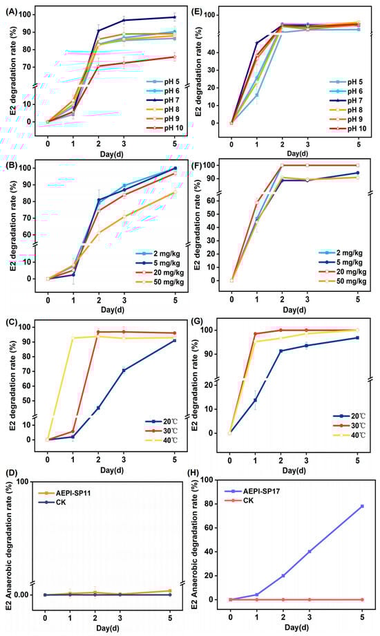 When the initial concentration of E2 was systematically varied, the degradation performance of AEPI-SP11 (Figure 2B) and AEPI-SP17 (Figure 2F) did not exhibit significant fluctuations. Even when the maximum added concentration of E2 reached 50 mg/kg, the degradation rate of AEPI-SP17 was still 90.92% within 5 days. As for the AEPI-SP11 strain, when the maximum added concentration of E2 was 50 mg/kg, its degradation rate reached 85.67% within 5 days. When comparing the degradation rates, although both AEPI-SP11 and AEPI-SP17 exhibited relatively stable degradation performance under different initial concentrations of E2, the degradation rate of AEPI-SP17 was consistently higher than that of AEPI-SP11. Over a temperature range of 20–40 °C, both AEPI-SP11 and AEPI-SP17 exhibited a high degradation effect on E2. At 30 °C, both strains reached their peak degradation efficiencies. The removal rates of E2 by AEPI-SP11 and AEPI-SP17 were 92.91% and 100%, respectively (Figure 2C,G).