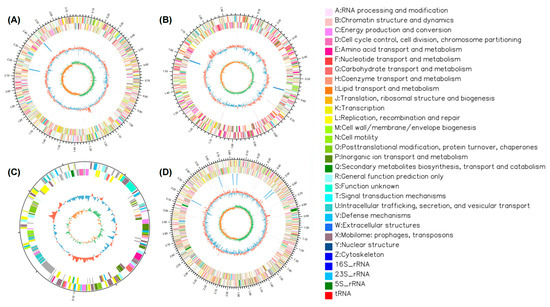 Genome sequencing plots of the strain Ochrobactrum sp. SP11 (chromosome 1, (A); chromosome 2, (B); plasmid, (C)) and the strain Acinetobacter_lactucae sp. SP17 (chromosome, (D)).