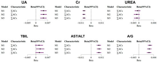 In the liver, many ACs are metabolized primarily by cytochrome P450 enzymes []. When a large amount of PAHs enters the metabolic system of an organism, they may damage liver cells and eventually affect the liver [,]. Studies have shown that increased exposure to PAHs in humans is associated with changes in liver biomarkers [] and with increases in liver biomarkers in pregnant women during early pregnancy []. Liver function tests (LFTs) are crucial diagnostic tools in essential practice for assessing liver disease [,]. Abnormal increases in serum bilirubin levels, such as total bilirubin (TBIL), indicate oxidative damage activity []. Increased aspartate aminotransferase/alanine aminotransferase (AST/ALT) ratios are linked to liver damage in hepatic disorders []. An elevated albumin/globulin ratio (A/G) is significantly correlated with liver fibrosis [].