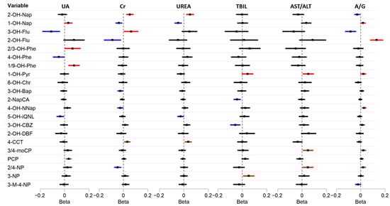 Multiple variables linear regression analysis of association between natural logarithmic transformed urinary AC concentrations and individual HRBs in coking workers. Different colors indicate the direction of the relationship: red indicates a positive relationship, blue indicates a negative relationship, and black indicates no significant relationship. Model adjusted for gender (categorical), age (continuous), smoking (categorical), and alcohol use (categorical).