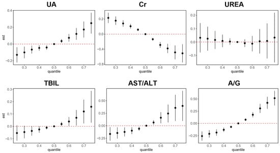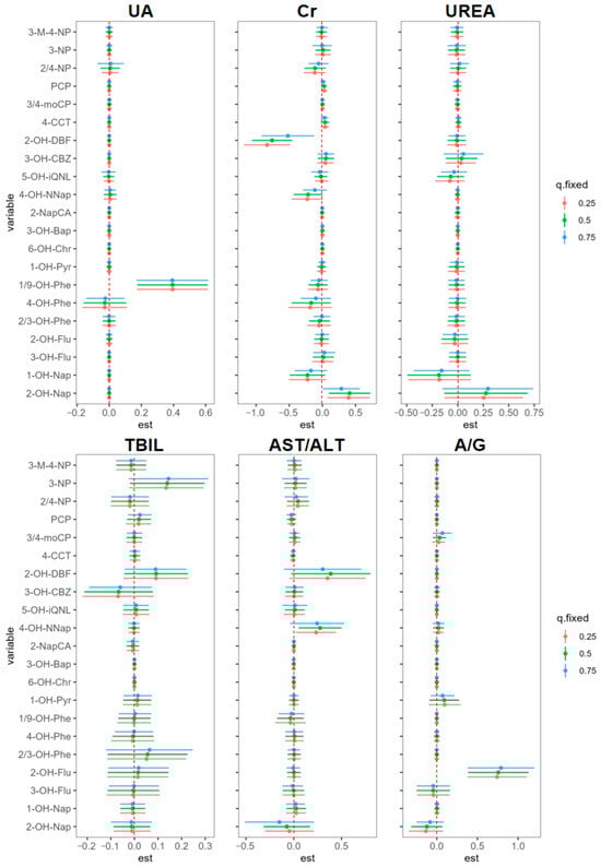 Subsequently, the nonlinear effects of simultaneous and individual exposure to different ACs and human hepatorenal functions were further investigated. Bayesian kernel machine regression (BKMR) analysis was used to further explore the nonlinear and non-additive relationship between highly correlated AC exposure and HRBs []. HRBs were used as the dependent variable one by one and all covariates were adjusted for in each BKMR calculation. This method estimates the posterior distribution between pollutants and health indicators through a Bayesian framework to quantify uncertainty. This method combines kernel machine learning techniques to effectively capture nonlinearities and complex interactions between variables. BKMR estimates the independent effects of each pollutant by modeling the relationship between the pollutant concentrations and target variables, while also considering the joint effects of multiple pollutants. In Bayesian inference, the prior distribution is combined with the likelihood function of the data to obtain the posterior distribution, which is then used to quantify the credible interval of the model results, thereby providing uncertainty in the effects of pollutant exposure. To investigate the role of individual ACs, differences in contamination-specific exposure–response patterns and interactions were exploited by using urine contaminant levels of varying intensities while fixing other exposures at the median, 25th, and 75th percentile. Using this quantile method can better deal with collinear data, explore nonlinear relationships, and avoid the interference of extreme values on the analysis results [].