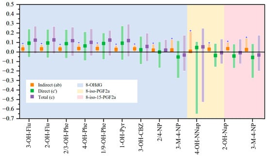 Oxidative stress damage may play a role in the process of environmental pollutants affecting human health, and we did not observe a significant association between individual ACs and the liver function biomarker TBIL in the analysis results of BKMR. Therefore, we used five OSBs for mediation analysis to confirm their possible average causal mediating role of individual ACs for HRB changes. 8-OHdG was found to mediate 23.14–58.62% of the AC-related increase in TBIL (p < 0.05), including exposures to six OH-PAHs and a metabolite of a PAH derivative (Figure 5). Additionally, 8-iso-PGF2α mediated 12.96% of the elevated TBIL associated with 4-OH-NNap (p < 0.05). 8-iso-15-PGF2α only played a mediating role in reducing TBIL in the negative correlation between two ACs and TBIL. In addition, no significant mediating effect of OSBs was found between other ACs and HRBs. Although the direct and total effects remained non-significant (Table S5), these findings suggest that the effects of ACs on TBIL are partly mediated by oxidative stress insults, such as DNA damage and lipid inflammation.
