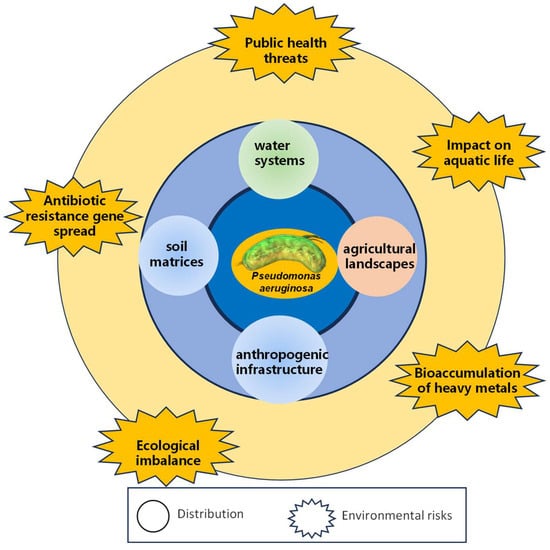 The distribution and environmental risks of MDR P. aeruginosa. This diagram illustrates the complex interactions and environmental pathways through which MDR P. aeruginosa spreads and poses risks.