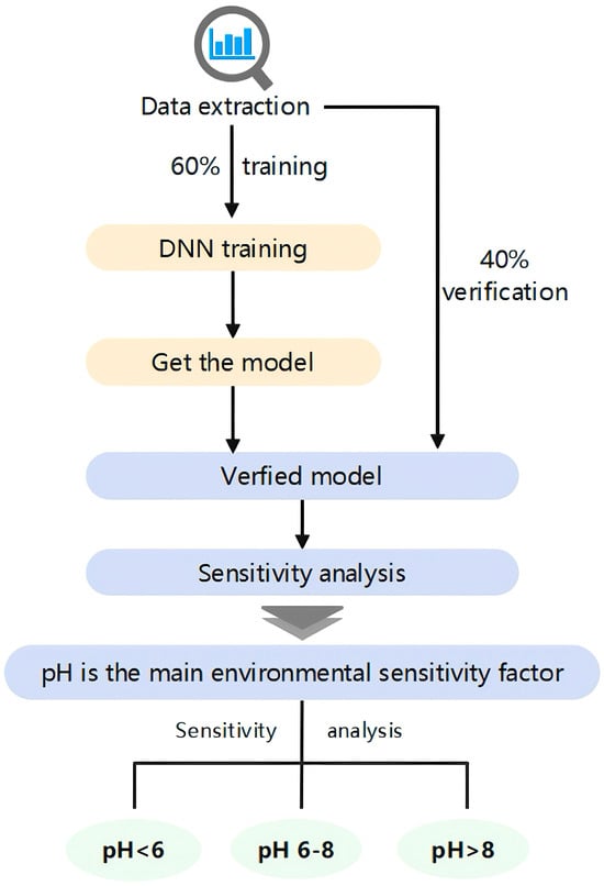 In order to clarify the most important factors affecting the non-reducing mineralization of uranium on Bacillus subtilis, we conducted sensitivity analyses on the data of the prediction and training sets (Figure 5). The results showed that the pH value was the most significant factor affecting both the training and prediction sets. Song et al. (2019) used XPS to investigate the composition and valence state of uranium–Bacillus subtilis bio-minerals, revealing that the product remains hexavalent []. This suggests that the immobilization of uranium by Bacillus subtilis is non-reductive, and the affinity between uranium and Bacillus subtilis is primarily driven by electrostatic and complexation interactions. In acidic pH, U(VI) in aqueous solution primarily exists as UO22+. As the pH increases, negatively charged uranyl ions such as (UO2)3(OH)7− and UO2(OH)3− dominate the solution. When the pH further increases to alkaline conditions, U(VI) precipitates as insoluble uranate precipitates (Na2U2O7) []. For Bacillus subtilis, changes in pH mainly impact its surface charge properties. Experiments have shown that as the pH increases, the zeta potential on the bacterial surface changes from positive to negative. When the pH is below 4, the zeta potential on the bacterial surface is >0, while above 4, it becomes negative. Thus, with increasing pH, negative charges in the solution increase, leading to an increase in repulsive forces between bacteria and uranium. Compared to other factors, pH directly alters the chemical form of uranium and the charge on the bacterial surface, thereby directly impacting their non-reductive mineralization process. Therefore, we speculate that, under similar conditions, in acidic soils rich in Bacillus subtilis, the non-reductive mineralization degree of uranium will be higher, and its mobility will be lower. Moreover, we suggest that when using Bacillus subtilis to treat uranium contamination, the pH value situation should be the first concern. Acidic conditions will be more conducive to the enrichment of uranium.