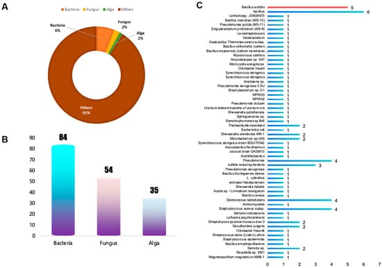 In this study, 14,936 articles related to uranium adsorption and mineralization were retrieved from PubMed and ScienceDirect using “uranium adsorption mineralization” as the keywords, and the publication time was limited to 29 February 2024 (Figure 2A). Among them, 598 documents (accounting for about 6%) use bacteria for uranium adsorption and mineralization, followed by fungi and algae, accounting for about 2% and 1%, respectively (Figure 2A,B). This shows that as a new type of uranium adsorbent, bacteria in microorganisms are widely studied by researchers [].