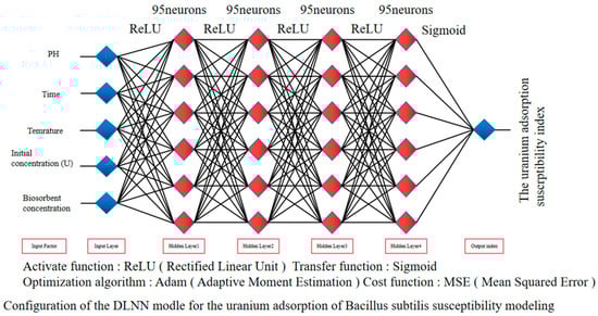 The model consists of one input layer, four hidden layers, and one output layer, with each hidden layer containing 95 neurons. The five influencing factors, the pH, time, temperature, initial concentration of uranium, and biosorbent concentration, are entered into the input layer and then processed and analyzed by the hidden layers. After feature transformation into the abstract features, the output layer obtains the classification results. In each neuron of the hidden layer, the rectified linear unit (ReLU) activation function was applied to the model, and the data were finally transformed to the output layer by the transfer sigmoid transfer function. Finally, this study uses the adaptive moment estimation (Adam) algorithm to construct a classification boundary to train the deep neural network model. This algorithm can help achieve a fast rate of convergence and good classification performance.