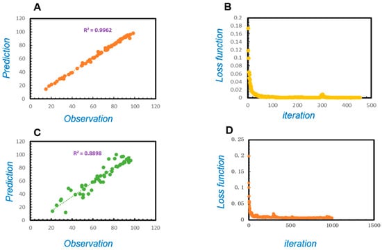 The tests of the model prediction performance: (A) the R2 of the training set, (B) loss function of the training set, (C) the R2 of the validating set, and (D) loss function of the validating set.