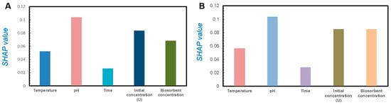 We tried to analyze the effect of independent variables on output dependent variables. The sensitivity of the model was analyzed using the SHAP method. Figure 5 shows the sensitivity of the SHAP analysis of five variables in the classification model of the training set (Figure 5A) and the validating set (Figure 5B), including the temperature, pH value, initial uranium concentration, adsorption time, and bacterial concentration. It was observed that the pH played the most important role in the non-reductive mineralization process of uranium by Bacillus subtilis, followed by the initial uranium concentration, temperature, and bacterial concentration. The importance of adsorption time is the lowest.