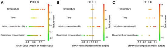 We combined the prediction set with the data from the training set for analysis. Figure 6 indicates the potential increased (red points) or decreased (green points) effects of the data on the activities. As can be seen from Figure 6A, the data show that under pH values of 0 to 6, temperature has the greatest impact, followed by initial concentration (U), biosorbent concentration, and time. Figure 6B shows that under pH values of 6 to 8, initial concentration (U) has the greatest impact, followed by time, then temperature, and biosorbent concentration has the least impact. The order of factors affecting uranium non-reductive mineralization at a pH greater than 8 is the same as that at pH 6–8 (Figure 6C).
