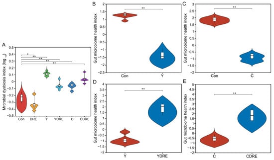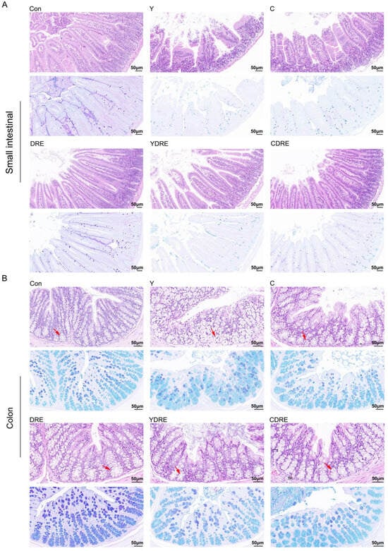 3.1. Effects of Y and C Exposure and DRE Intervention on the Intestine