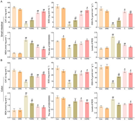 3.1.3. DRE Alleviated Intestinal Oxidative Stress in Mice Exposed to Y or C